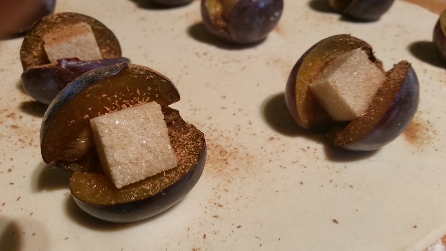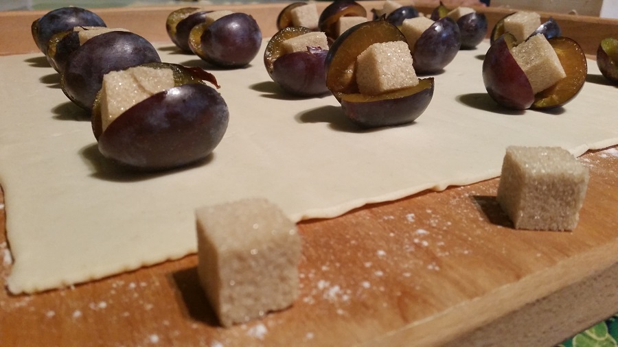 Na jedną warstwę ciasta układam śliwki z kostką brązowego cukru…