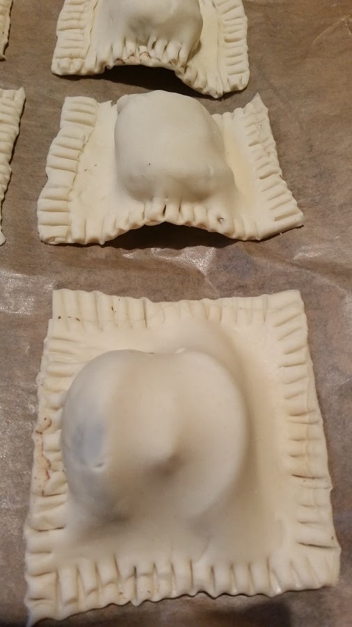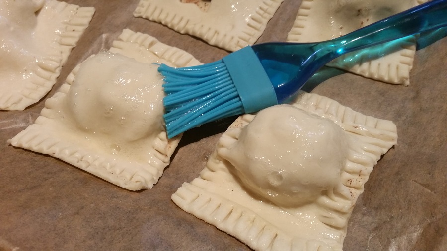 Kroję ciasto na kwadraty/ prostokąty i przykrywam drugą warstwą ciasta …
