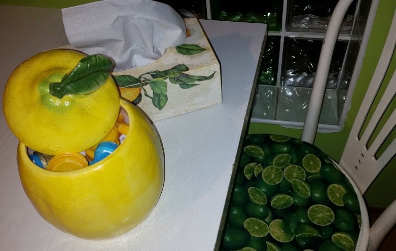 Jeszcze fotka dodatków z motywem cytryny: chustecznik , poduszka na krzesło,ceramiczny pojemnik, który wykorzystuję na zbieranie zakrętek z plastikowych butelek. Trzeba je zbierać! Wiąże się to z akcją charytatywno – ekologiczną. Można w ten sposób pomóc m.in. w dofinansowaniu sprzętu do rehabilitacji .