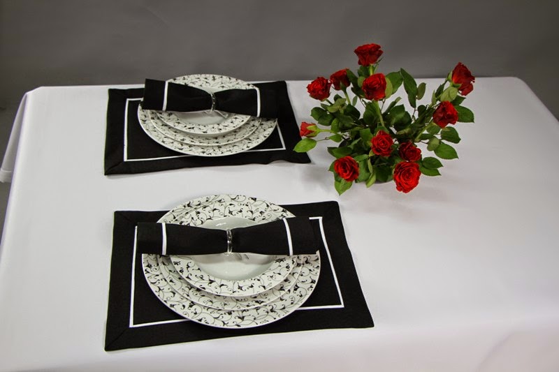 | biały obrus z czarnymi nakładkami i białymi serwetkami |
