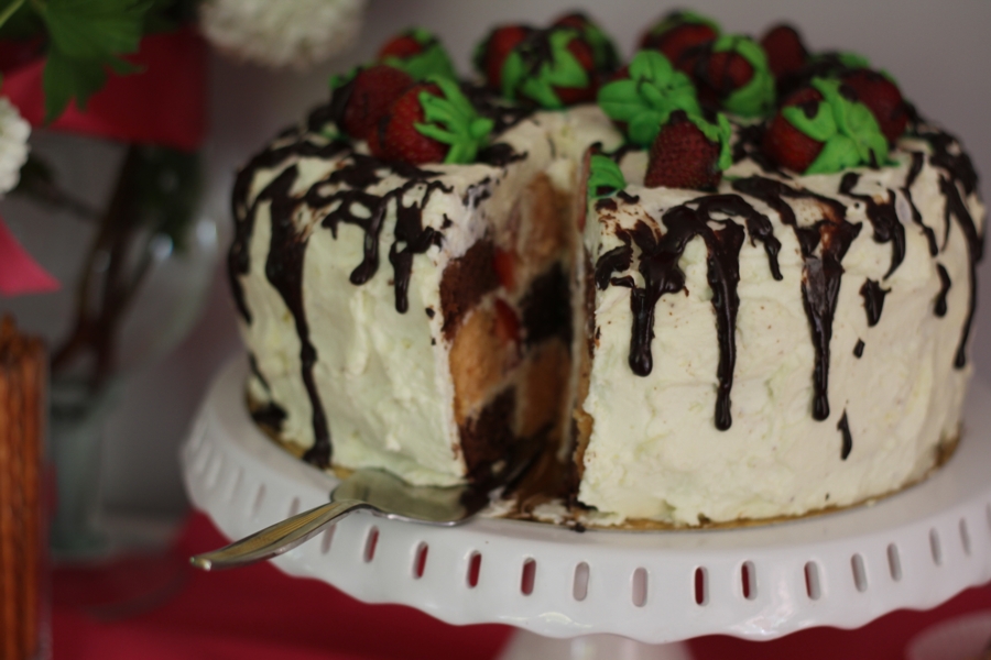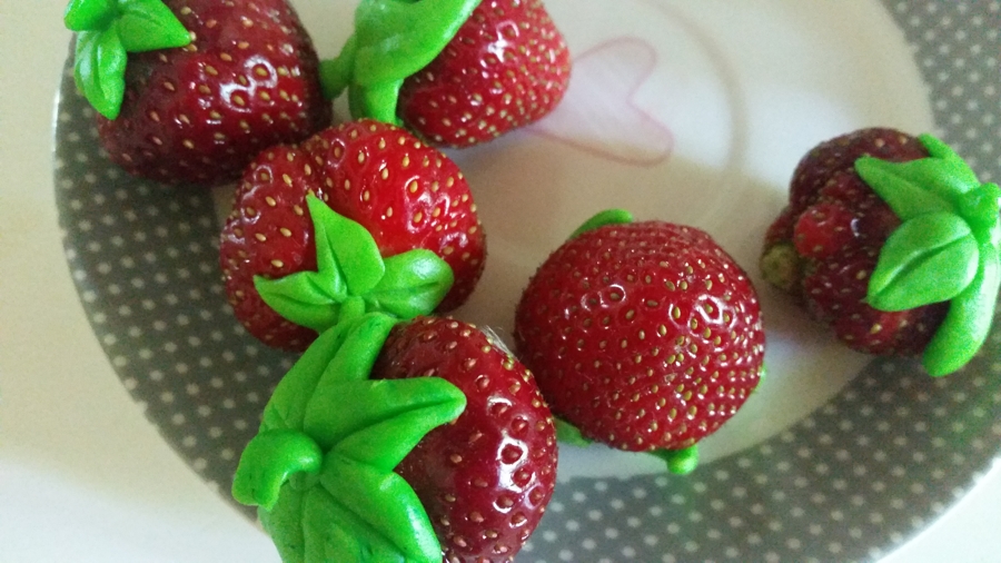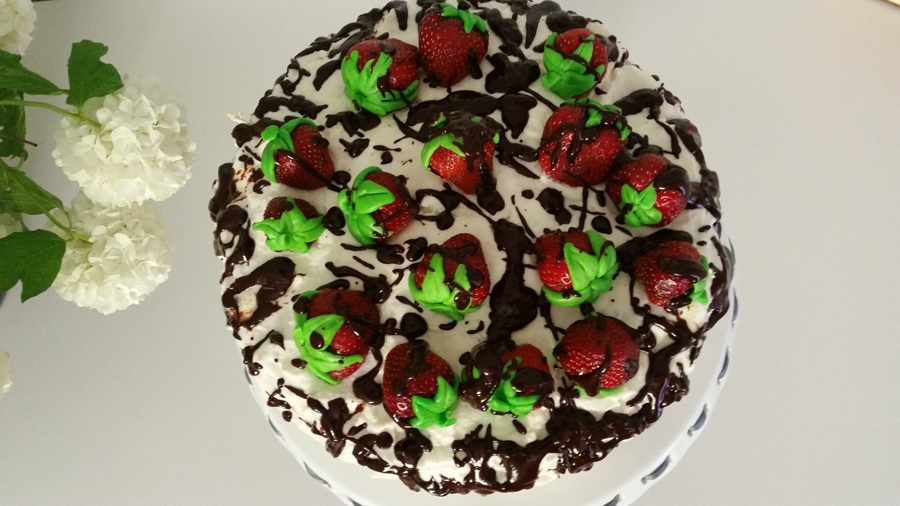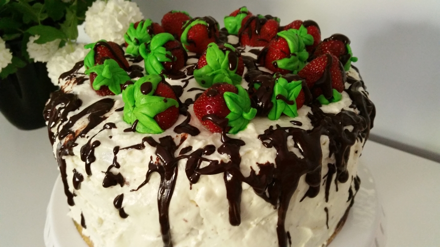Zrobiłam majowy tort z truskawkami. Szypułki zrobiłyśmy z masy cukrowej, żeby było kolorowo i żeby nie było problemu z niejadalnymi ozdobami.