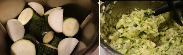 • Obraną cebulę pokrojoną w ćwiartki i pokrojoną cukinię z solą posiekać w TM poz.4 przez 15s