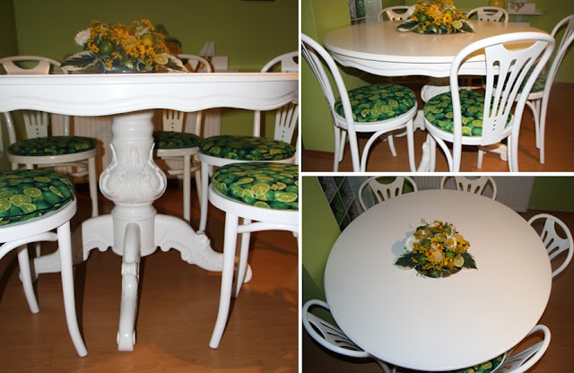 Tak ekonomicznej wersji rozwiązania problemu się nie spodziewałam. Nie kombinując samodzielnego malowania stołu oddaliśmy go do zaprzyjaźnionego stolarza. Został profesjonalnie pomalowany na biało i taki jest obecnie jego wygląd: