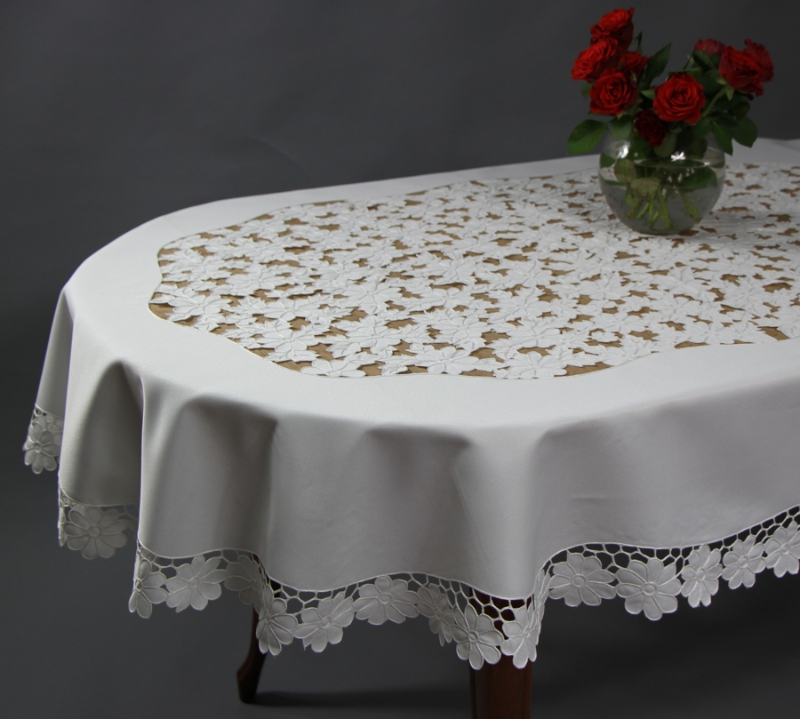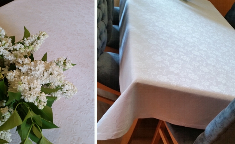 Najnowocześniejsze technologicznie tkaniny są idealną imitacją tkanin naturalnych – nie mają nic wspólnego z pierwszymi obrusami plamoodpornymi z przed kilku lat. Wysoka gramatura, brak sztucznego błyszczenia to zalety nowoczesnych tkanin obrusowych. Gdy do tego dodamy wzór żakardowy mamy najpraktyczniejszy obrus z możliwych. Pierzesz i po wysuszeniu w stanie maksymalnie rozłożonym kładziesz na stół 🙂 Efekt – sprawdź na zdjęciu: