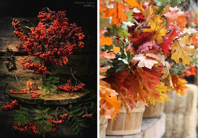 Zdecydowanie na stole muszą stać kwiaty lub ich ciekawy zamiennik! Kwiaty nadają uroku stwarzają nastrój i miłą atmosferę. Jest to dopełnienie zadbania o stół, wnętrze. Pisząc kwiaty nigdy nie myślę kwiaty sztuczne. Obecnie można kupić całkiem ładne sztuczne kwiaty, ale nie. Dużo lepiej postawić choćby liście,trawy czy cokolwiek innego „żywego” w wazonie, niż najpiękniejsze wytworzone kwiaty. Jesień jest bogata w zamienniki klasycznych kwiatów; pięknie przebarwione liście, żołędzie, kasztany, jarzębina, dzika róża, kapusta..