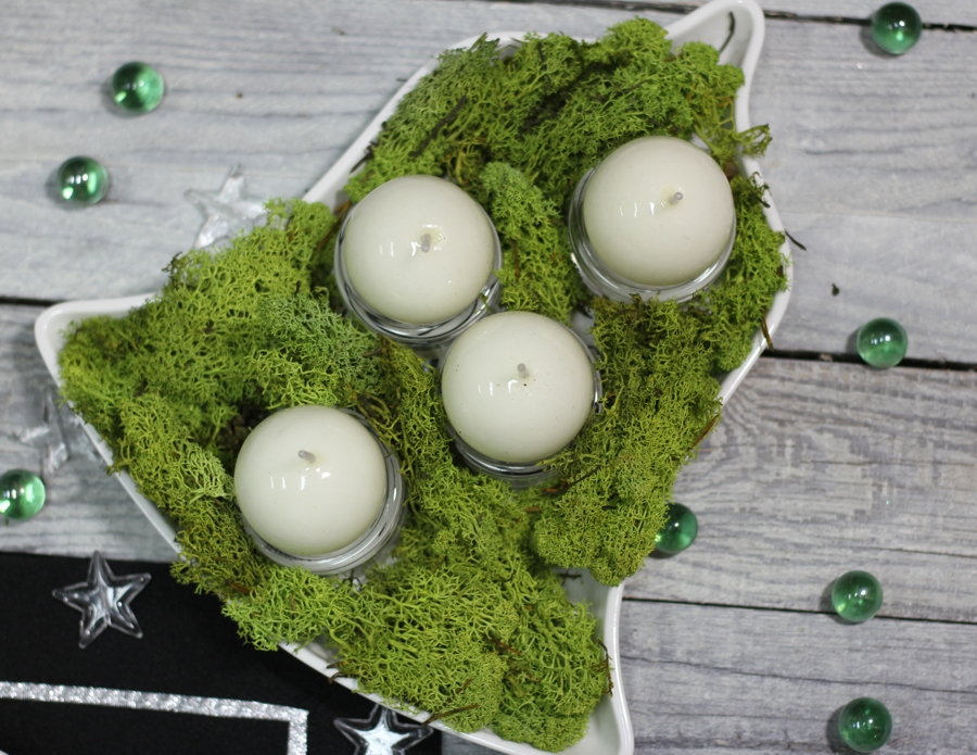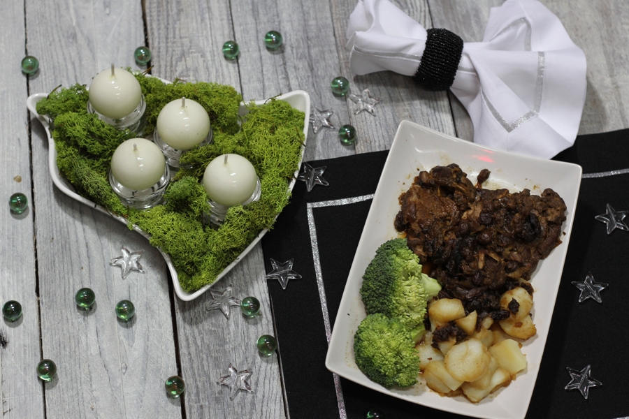 Danie jest niekłopotliwe w przygotowaniu niesamowite i zaskakujące w smaku. Przygotowałam inspirację świąteczną z oryginalnymi kolorami dla świąt Bożego Narodzenia: wiosenny zielony w połączeniu z bielą i czernią. Świeczki ułożyłam w ceramicznym naczyniu w kształcie dzwona wypełnionym sztucznym mchem. Położyłam pod świece małe szklane świeczniki, żeby zadbać o bezpieczeństwo zapalonych świec. Trzeba o tym pamiętać – moja koleżanka miała już niestety płonący stół, który zapalił się od świecy w świątecznym stroiku.
