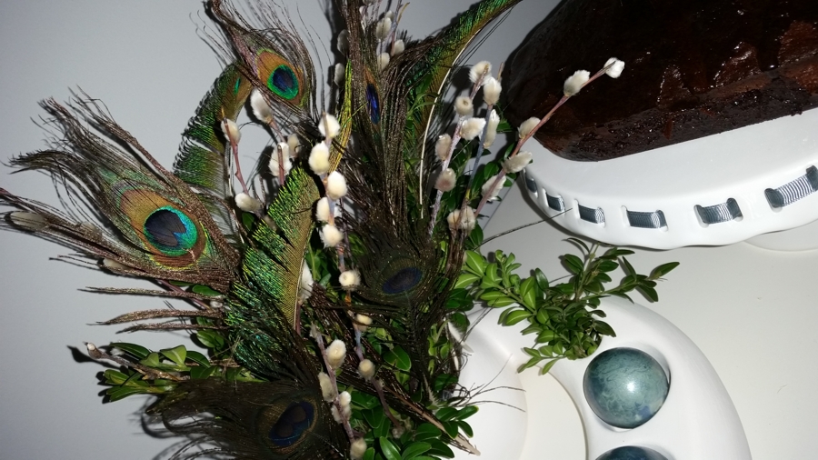 Pawie pióra połączyłam z baziami i bukszpanem.