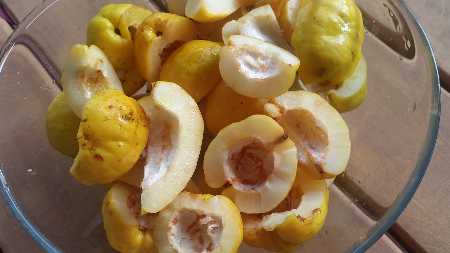- umyte owoce pigwowca wydrążam przy pomocy męża i ojca z gniazd nasiennych