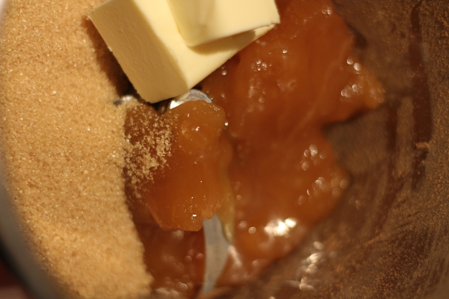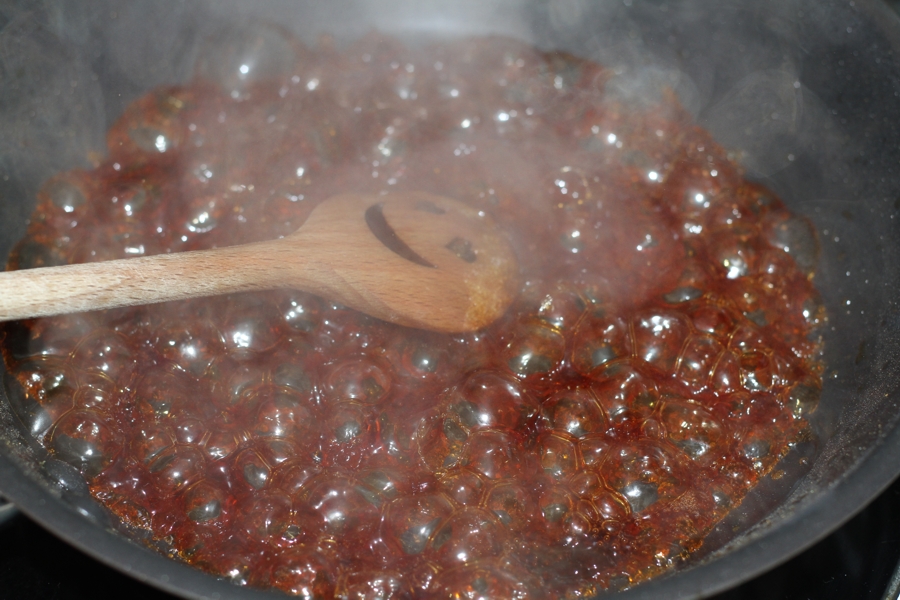 Gdy cukier zaczyna się topić mieszam go drewnianą łyżką. Jak nie ma już białych kryształków cukru – jest tylko ciemny karmel – dolewam trochę wody (ostrożnie) . Robi się z tego parujący wulkan. Po wymieszaniu można tą masę wlać do ciasta.