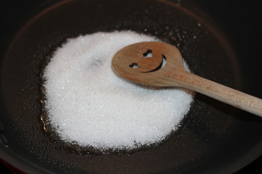 Jednym z elementów jest stopiony na karmel cukier. Na rozgrzaną patelnię wysypuję odważony cukier
