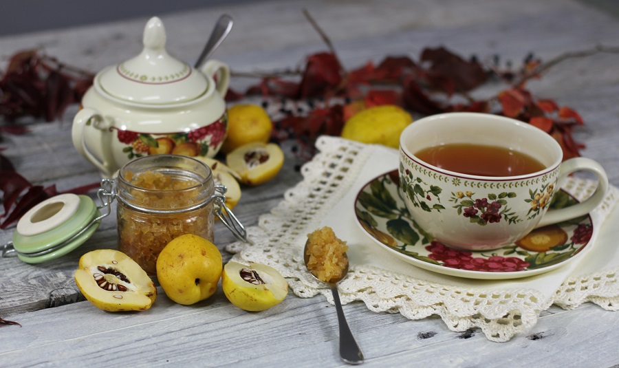 Przyznam szczerze, że już na drugi dzień przy mroźnej pogodzie rozgrzewałam się gorącą herbatą z dodatkiem owoców pigwowca z cukrem nie czekając na te 2 tygodnie. Podbieram ze słoja regularnie zawartość częstując wszystkich domowników i gości tym pysznym dodatkiem. Najbardziej smakuje mi taka doprawiona pigwą herbatka z filiżanki, którą w całym komplecie pięknych naczyń dostaliśmy od mojej przyjaciółki ze średniej szkoły z okazji 25-lecia rocznicy ślubu. Basiu zapraszam na herbatkę z pigwą z pięknej zastawy Rajski Ogród 🙂