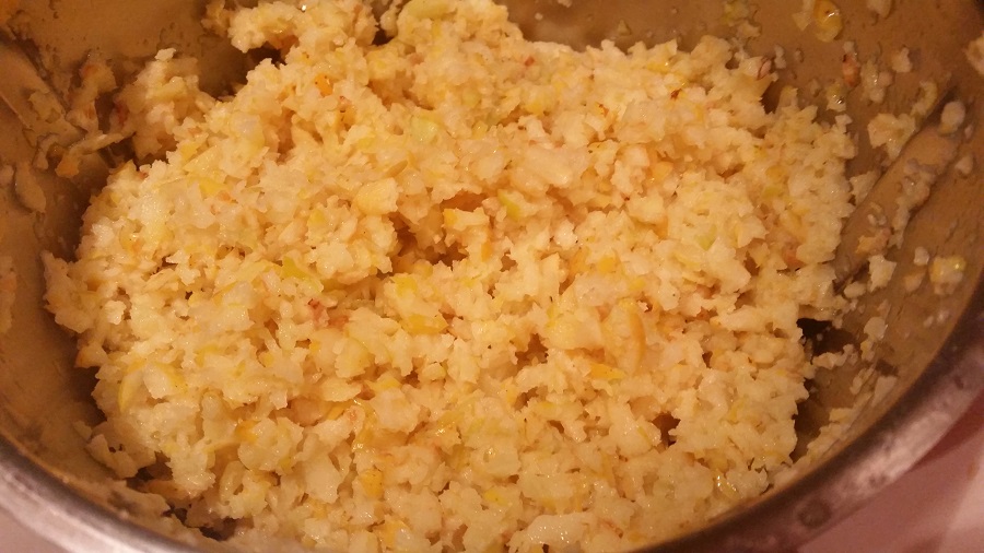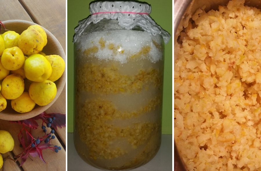 Najtrudniejszą czynnością jest oczyszczenie pigwowca z gniazd. Zdecydowanie jest to zajęcie dla facetów – paniusie mają zbyt delikatne ręce na tą czynność:) U mnie tata i mąż przekomarzając się ze sobą, oprawili prawie 4 kg tego twardego jak kamień owocu.