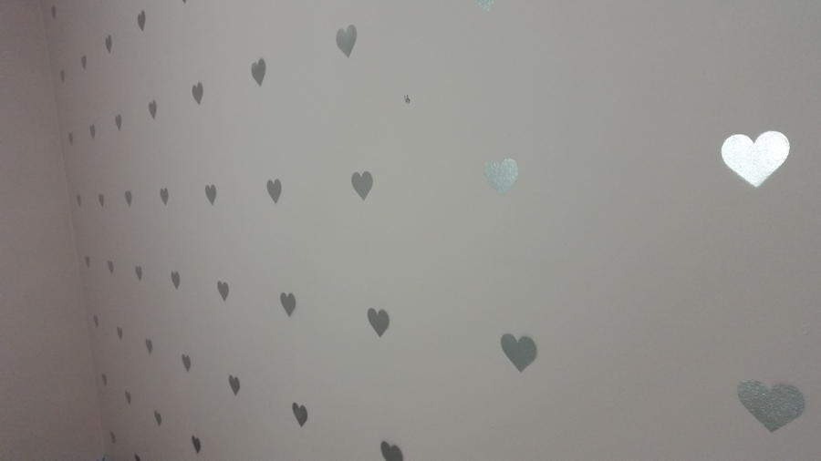 Na jednej ze ścian muszą być serduszka lub duże grochy. Szablon z grochami da się kupić z serduszkami już gorzej. Dodatki miały być złote lub srebrne.