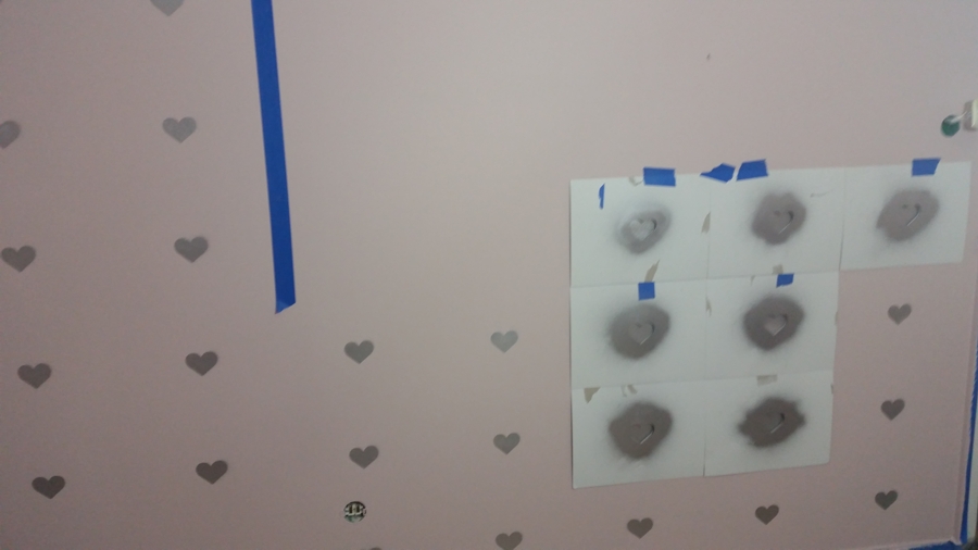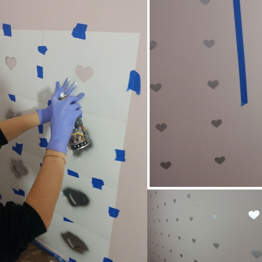 Szablony zrobiłam sama wycinając serduszka na tekturze rozmiaru A3. Mogę podpowiedzieć, że trzeba bardzo pilnować odległości, żeby nie skrzywić rzędów regularnych serduszek. Naklejałam sobie pomocnicze linie niebieską taśmą i przeklejałam szablony tak, aby stykały się linią boczną i górną kartonów.