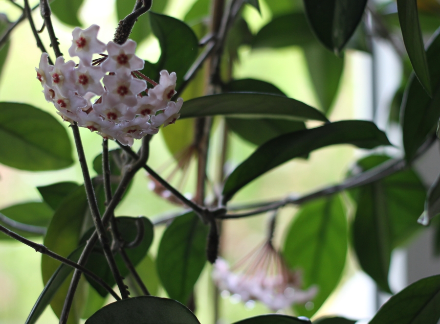 Ciemny fiolet na 2 ścianach pozostał po wyborach starszej siostry. Wymyśliłam, że kolor ścian będzie teraz w ciepłym odcieniu beżu lub różu. Idealny byłby kolor kwiatów hoi , która ciągle kwitnie na oknie w pokoiku. Wieczorami prześlicznie też pachnie:)