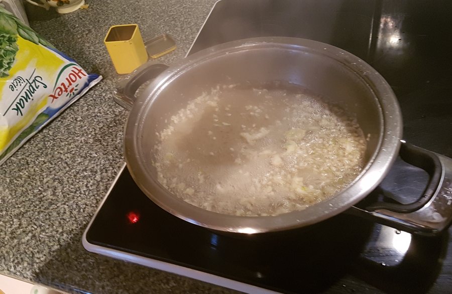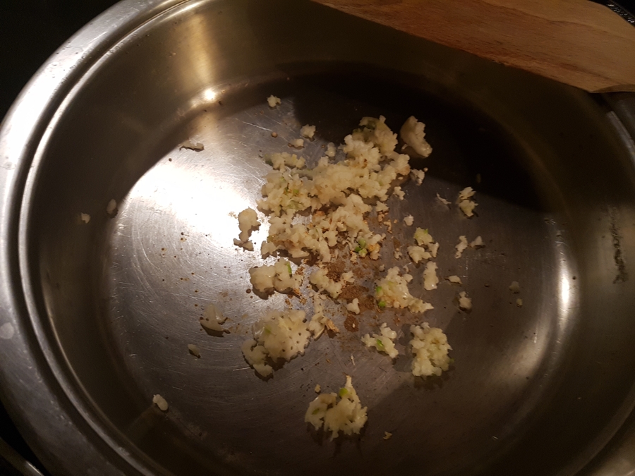 3.Na niezbyt gorącą patelnię Zepter wrzuciłam zgnieciony czosnek (nie musi być Zepter – może być zwykła patelnia)