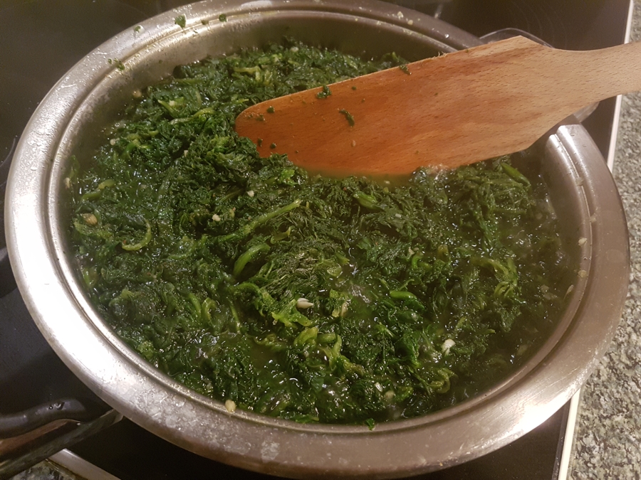 7. Po chwili szpinak się rozmroził – dodałam 1 łyżeczkę gałki muszkatałowej