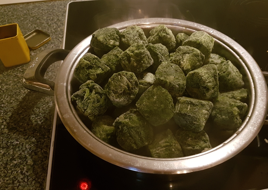 6.Wyłożyłam zamrożony szpinak w liściach, przykryłam patelnię pokrywą