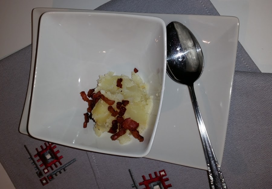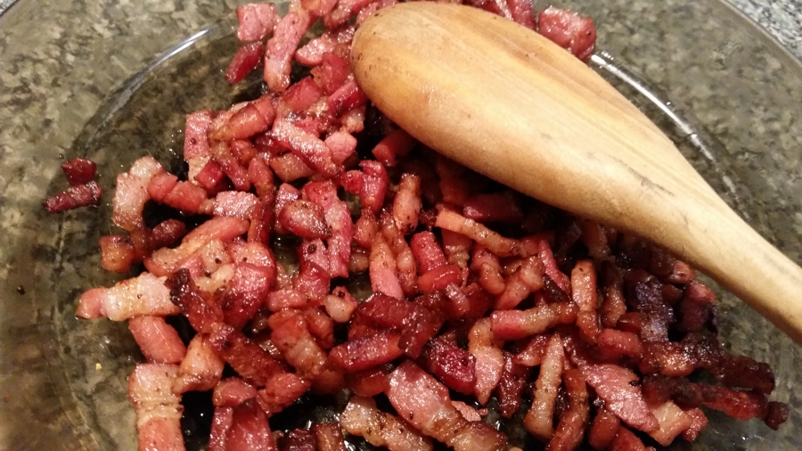 Trochę rozdrobnione ziemniaki posypałam skwarkami z boczku: