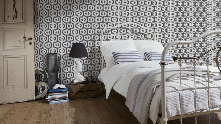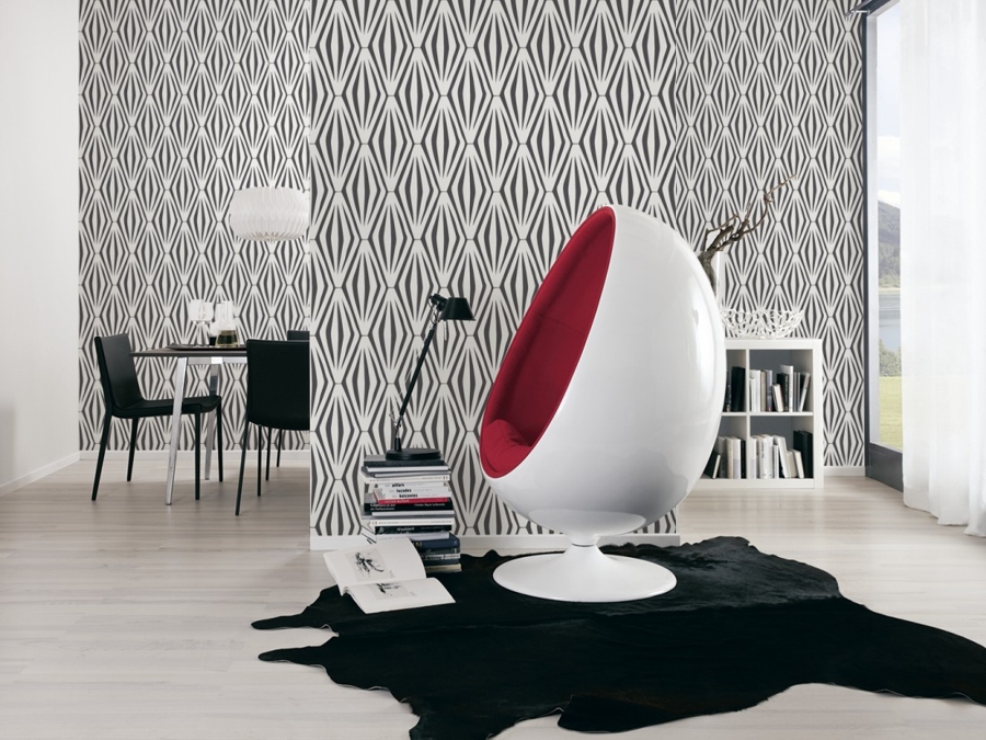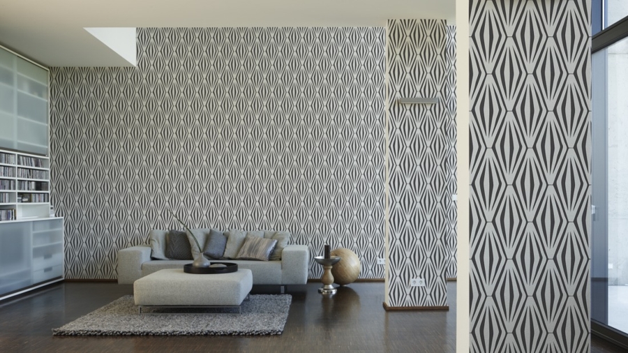 Wybór tapety wcale nie jest łatwy , ponieważ tapet jest mnóstwo. Ja wiedziałam,że chcę coś we wzory geometryczne, najwyżej dwa kolory. W mojej okolicy jest świetnie zaopatrzony sklep z tapetami, ale niestety nic tam mnie nie zauroczyło do tego stopnia, żebym chciała to widzieć przez kilka lat na mojej ścianie. Przeczesałam więc sklepy internetowe z tapetami. Tu pojawił się problem rozeznania rzeczywistych wielkości wzorów graficznych. Aż trafiłam do świetnego sklepu internetowego z olbrzymią ofertą MIDEN – prezentacja wzorów tapet jest rewelacyjna. Każdy wzór tapety można zobaczyć w rzeczywistych wielkościach w kilku wnętrzach. Moja wybrana tapeta wyglądała tak: