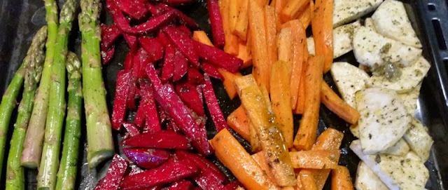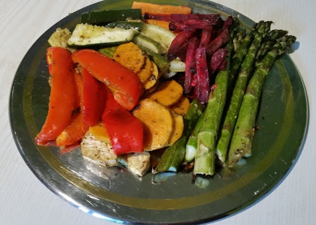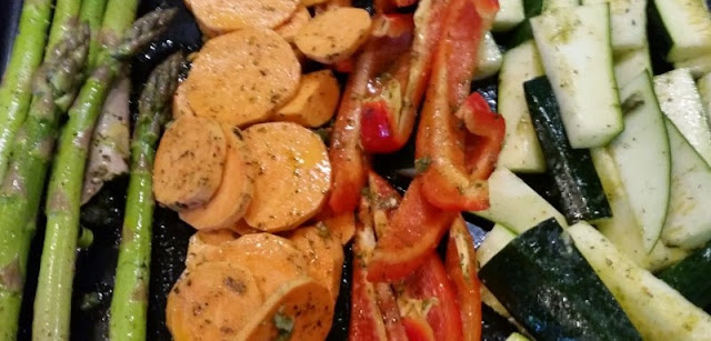 Przyjaciółka mojej córki jest na diecie warzywnej- wygląda przepięknie schudła i jest pełna energii. Jej zdjęcia potraw na Instagramie (sprawdźcie sami LINK) zainspirowały mnie do upieczenia różnych warzyw. Przyznam się, że do tej pory nie lubiłam szparagów, ale te z przepisu Basi są przepyszne! Wszystkie warzywa są al dente.