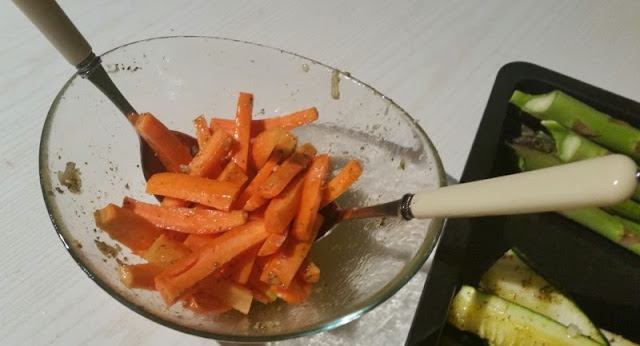 Poszczególne warzywa w małej ilości sosu mieszałam w miseczce,żeby każdy kawałek warzywa był delikatnie „umazany” w sosie